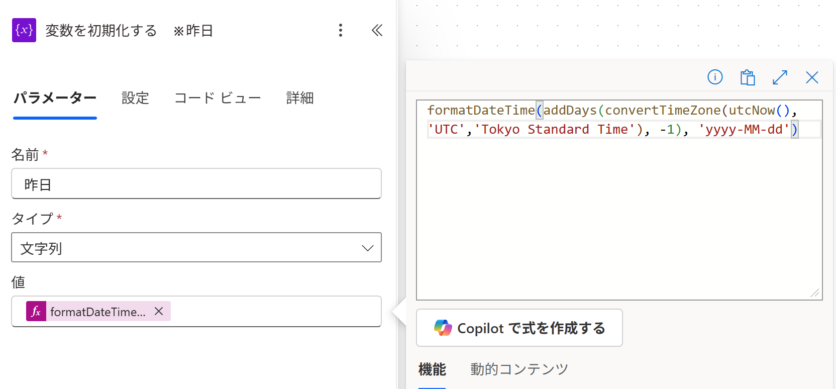 formatDateTime(addDays(convertTimeZone(utcNow(),'UTC','Tokyo Standard Time'), -1), 'yyyy-MM-dd')