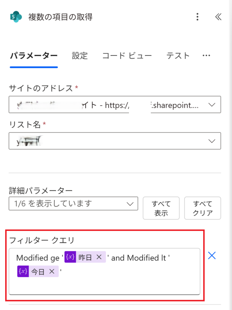 Modified ge '@{variables('昨日')}' and Modified lt '@{variables('今日')}'