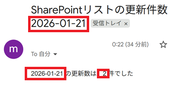 無事にメールが届きました。ちゃんと更新日時が1/21の2件を拾ってくれましたね。